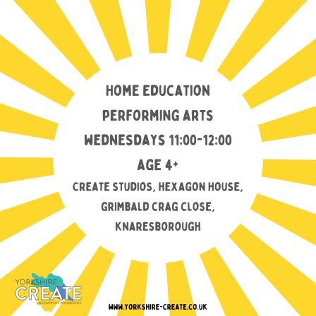 Yorkshire CREATE's Performing Arts class offers an opportunity for young learners to explore communication, collaboration and creativity in a safe space. Participants will have the opportunity to develop their skills in drama, singing, movement and art.